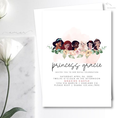 Modern Disney Princess Birthday Invitation Watercolor Disney Etsy